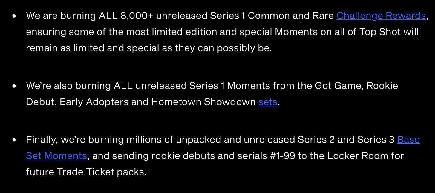 While users might not see this burn reflect in the market prices, the move was a great show of good faith from Top Shot. Supply has always been the elephant in the room, and burning a huge supply of unreleased moments (that they easily could’ve sold and made a ton of profit on) is a community > money move. Love to see it!